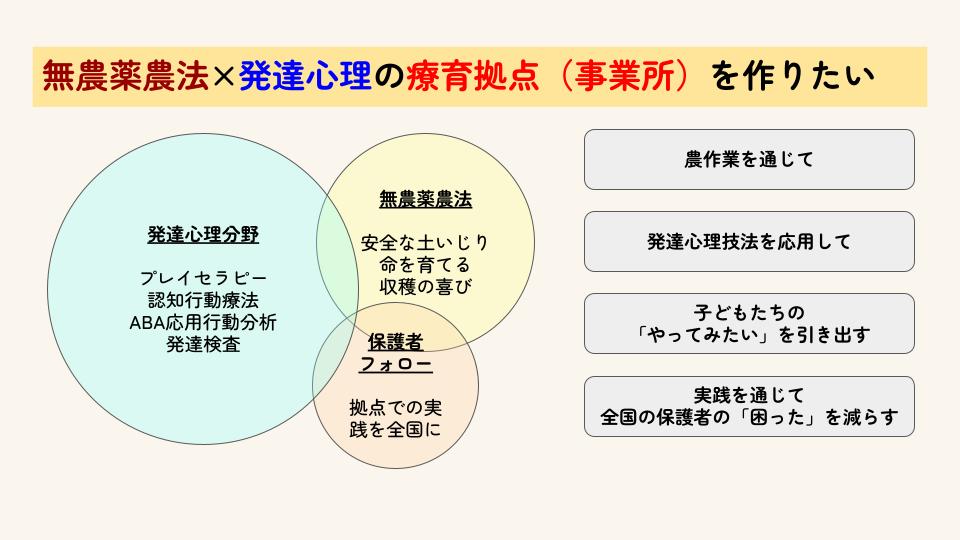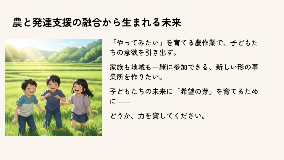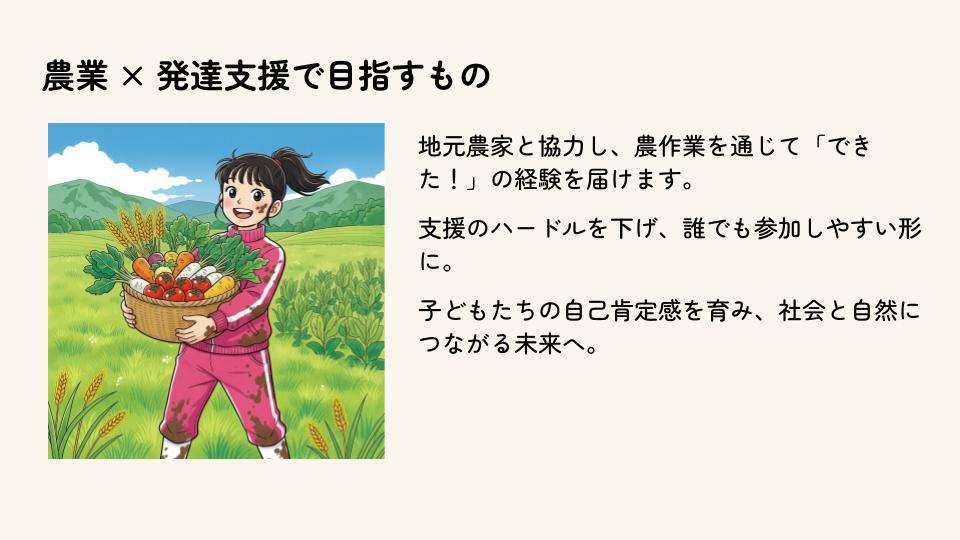 児発・放課後等デイの児童心理療育チームあぐりの準備をしています 2025.08.31 2019.04.15 私たちは、次のようなプランを元に、農福連携を軸にした児童発達支援・放課後等デイサービスの事業の準備を行っています。